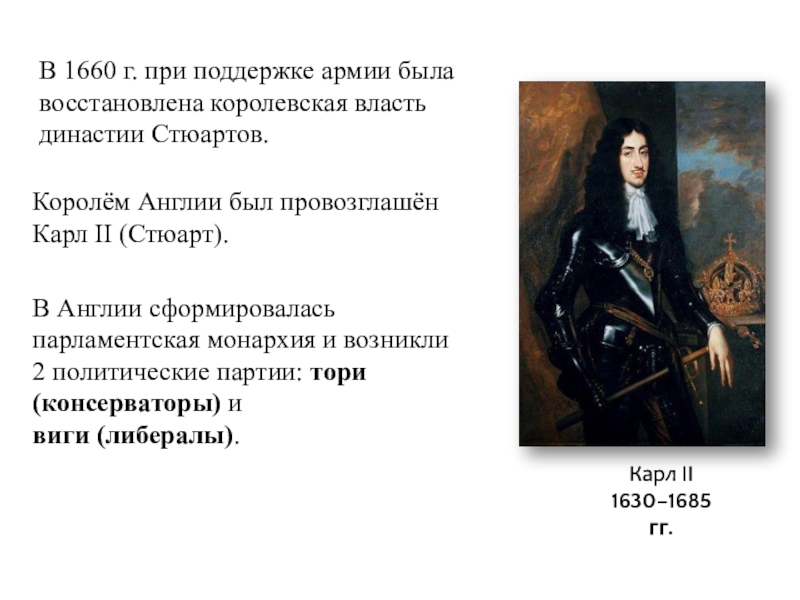 В Англии сформировалась парламентская монархия и возникли 2 политические партии: тори (консерваторы) и