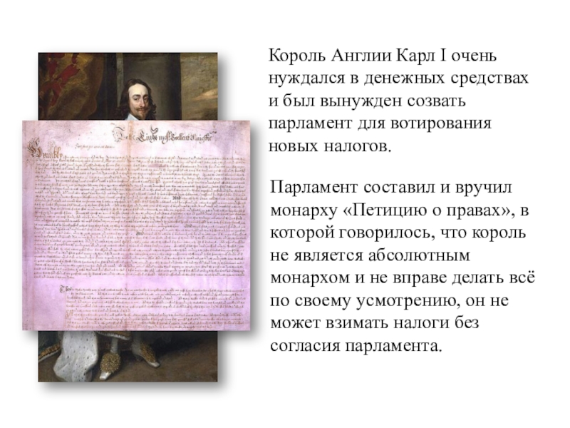 Парламент составил и вручил монарху «Петицию о правах», в которой говорилось, что король не является абсолютным монархом и не вправе делать всё по своему усмотрению, он не может взимать налоги без согласия парламента.