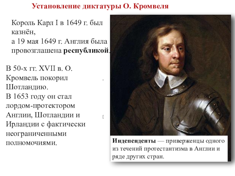 После казни короля и провозглашения республики формально страной управлял парламент и индепенденты, однако фактически власть оказалась в руках