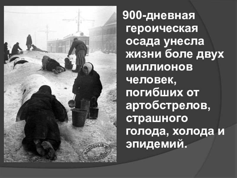 Слайд 13 900-дневная героическая осада унесла жизни боле двух миллионов человек, погибших