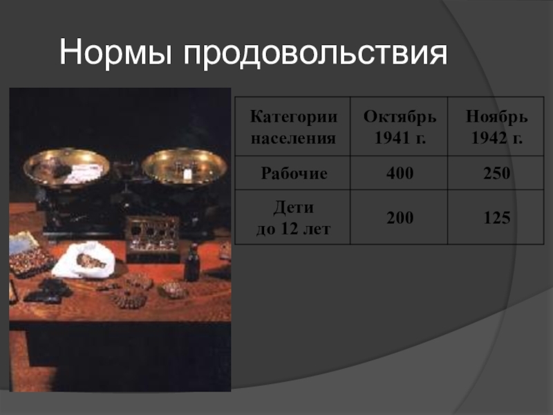 человек гражданского населения, в том числе около 400 тысяч детей. Уже к лету 1942 г. официально зарегистрировано 1,2 млн. смертей. Сначала умирали пожилые, больные и ослабленные, потом те, кто целенаправленно жертвовал собой, спасал тем самым своих близких, многие ленинградцы считали, что он выжили благодаря тому, что мертвые спасая живых, оставляли им свой паек.
