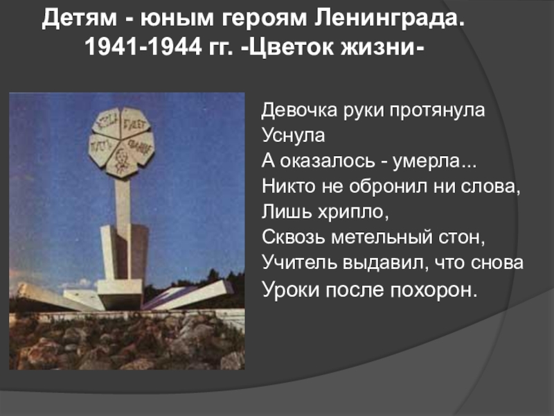 Слайд 26Детям - юным героям Ленинграда. 1941-1944 гг. -Цветок жизни-