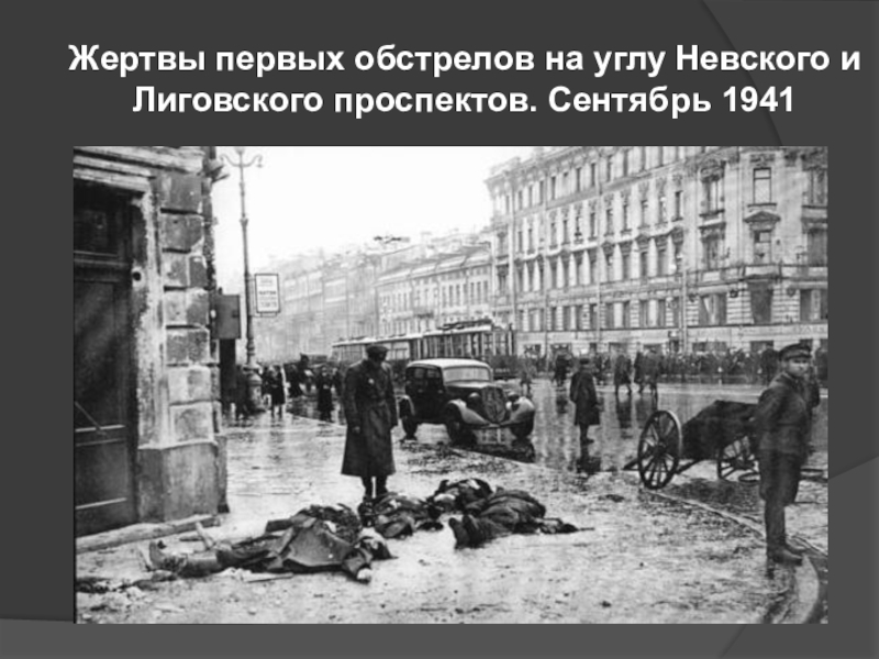 Слайд 5Жертвы первых обстрелов на углу Невского и Лиговского проспектов. Сентябрь 1941