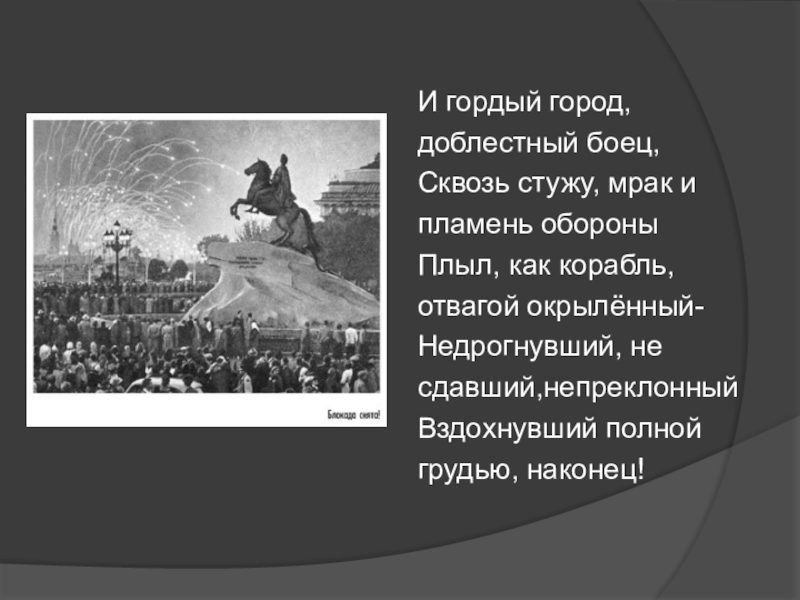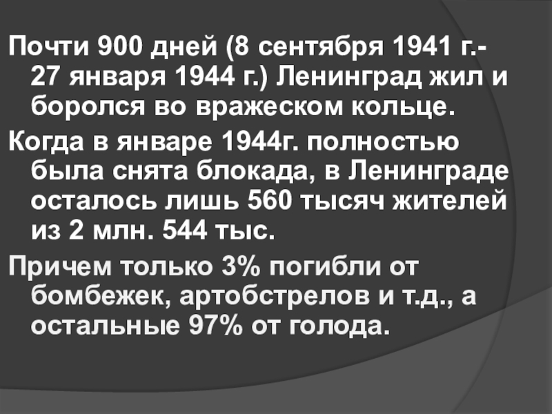 Когда в январе 1944г. полностью была снята блокада, в Ленинграде осталось лишь 560 тысяч жителей из 2 млн. 544 тыс.