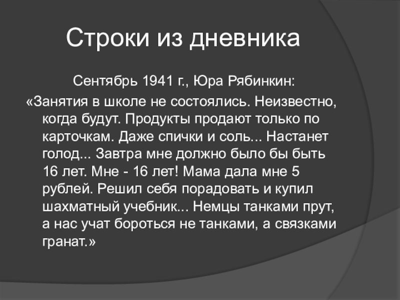 Неизвестно, когда будут. Продукты продают только по карточкам. Даже спички и соль... Настанет голод... Завтра мне должно было бы быть 16 лет. Мне - 16 лет! Мама дала мне 5 рублей. Решил себя порадовать и купил шахматный учебник... Немцы танками прут, а нас учат бороться не танками, а связками гранат.»