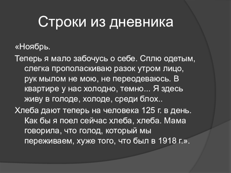Хлеба дают теперь на человека 125 г. в день. Как бы я поел сейчас хлеба, хлеба. Мама говорила, что голод, который мы переживаем, хуже того, что был в 1918 г.».