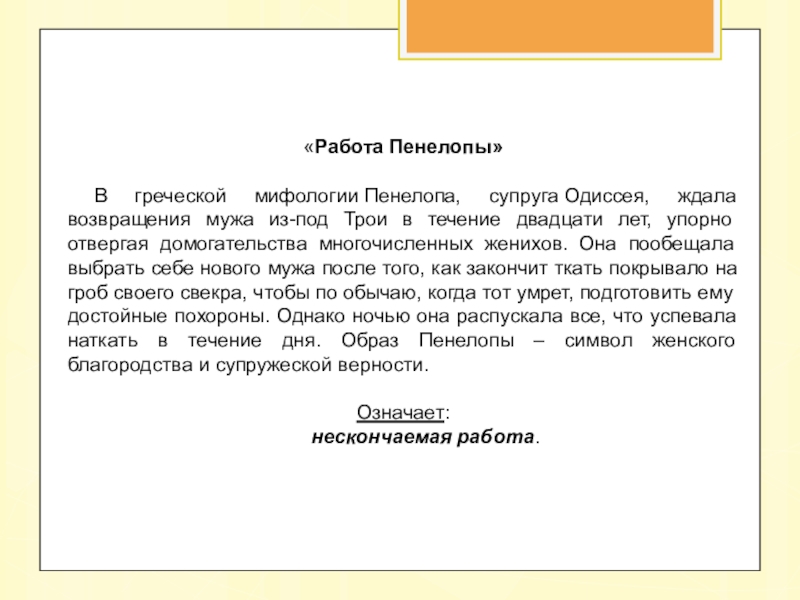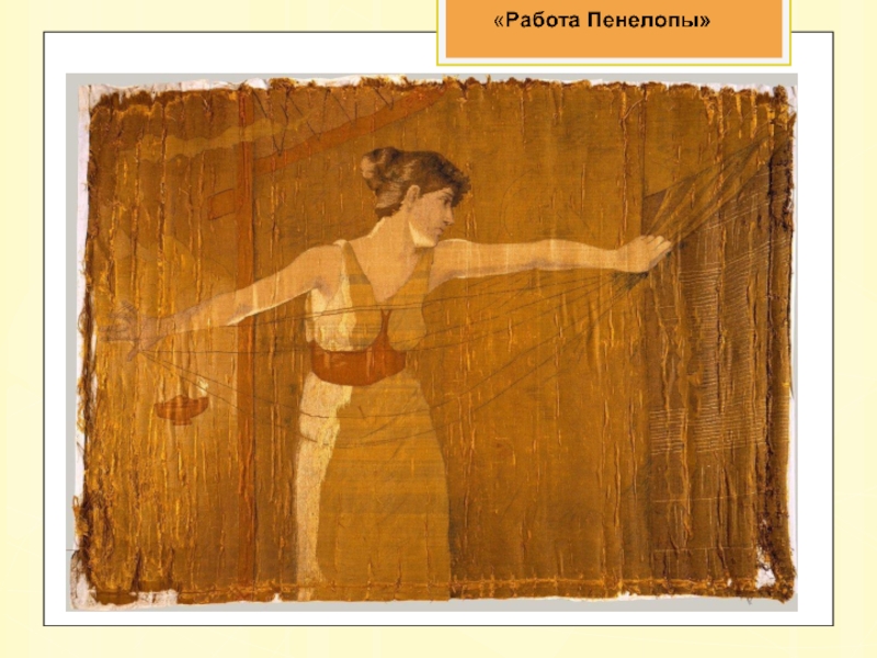 из-под Трои в течение двадцати лет, упорно отвергая домогательства многочисленных женихов. Она пообещала выбрать себе нового мужа после того, как закончит ткать покрывало на гроб своего свекра, чтобы по обычаю, когда тот умрет, подготовить ему достойные похороны. Однако ночью она распускала все, что успевала наткать в течение дня. Образ Пенелопы – символ женского благородства и супружеской верности.