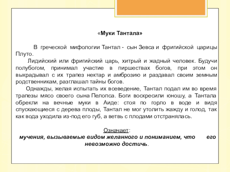 «Муки Тантала» - мучения, вызываемые видом желанного и пониманием, что его невозможно достичь.