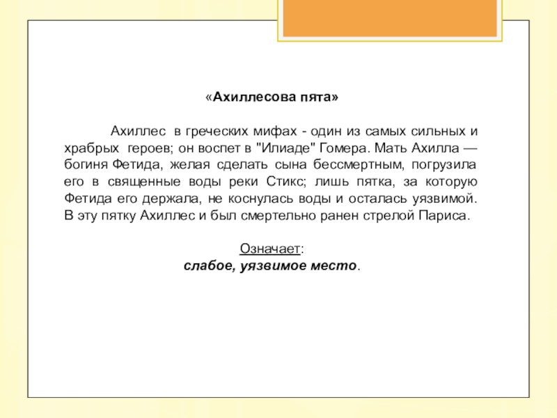 «Ахиллесова пята» - означает слабое, уязвимое место.