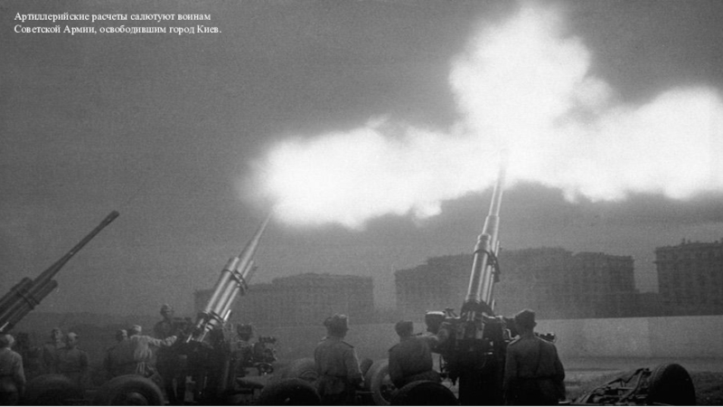Слайд 13Артиллерийские расчеты салютуют воинам Советской Армии, освободившим город Киев.