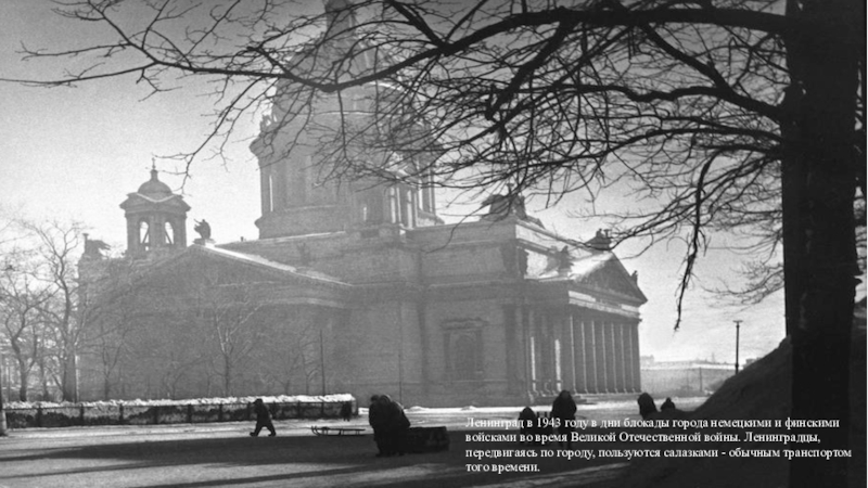войсками во время Великой Отечественной войны. Ленинградцы, передвигаясь по городу, пользуются салазками - обычным транспортом того времени.