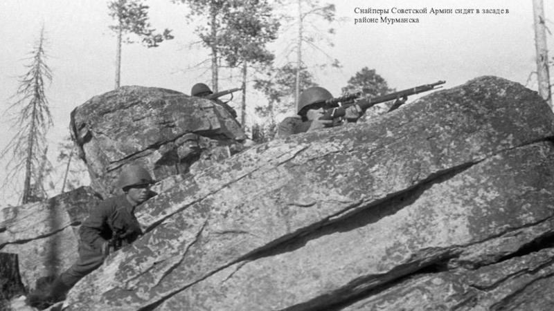 Слайд 48Снайперы Советской Армии сидят в засаде в районе Мурманска