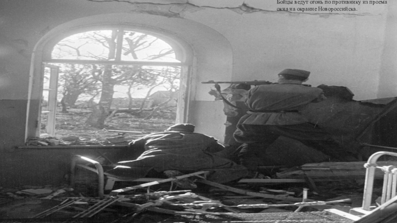 Слайд 39Бойцы ведут огонь по противнику из проема окна на окраине Новороссийска.
