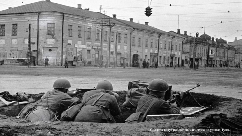 Слайд 43Солдаты ведут наблюдение из окопа на улицах Тулы.