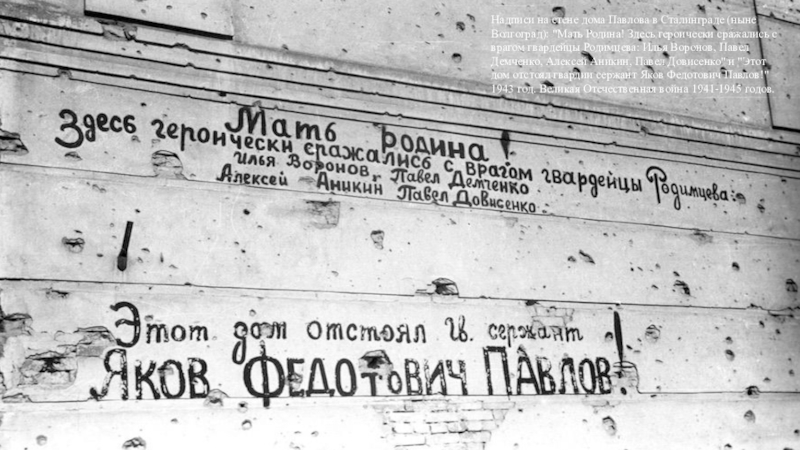 Слайд 59Надписи на стене дома Павлова в Сталинграде (ныне Волгоград): "Мать Родина!