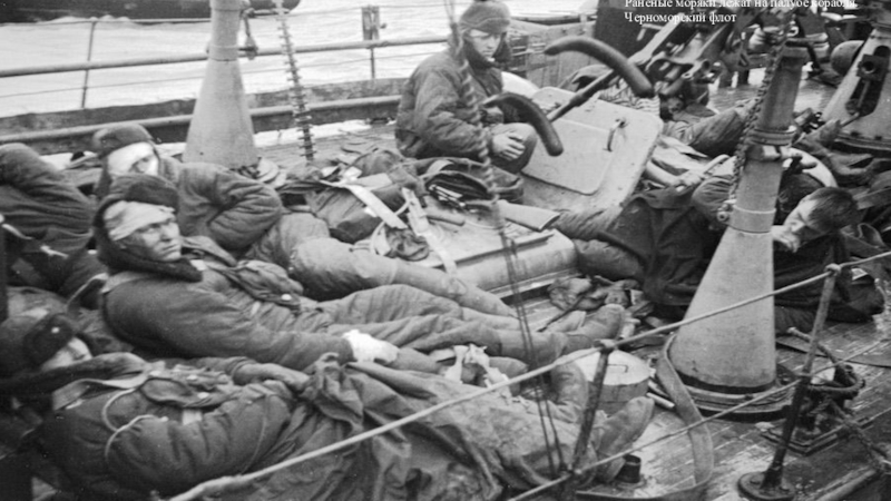 Слайд 33Раненые моряки лежат на палубе корабля. Черноморский флот