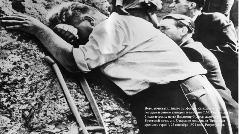 наук) Владимир Фурсов скорбит у стены Брестской крепости. Открытие мемориала "Брестская крепость-герой", 25 сентября 1971 года. Репродукция.