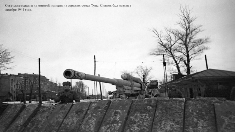 Слайд 45Советские солдаты на огневой позиции на окраине города Тулы. Снимок был