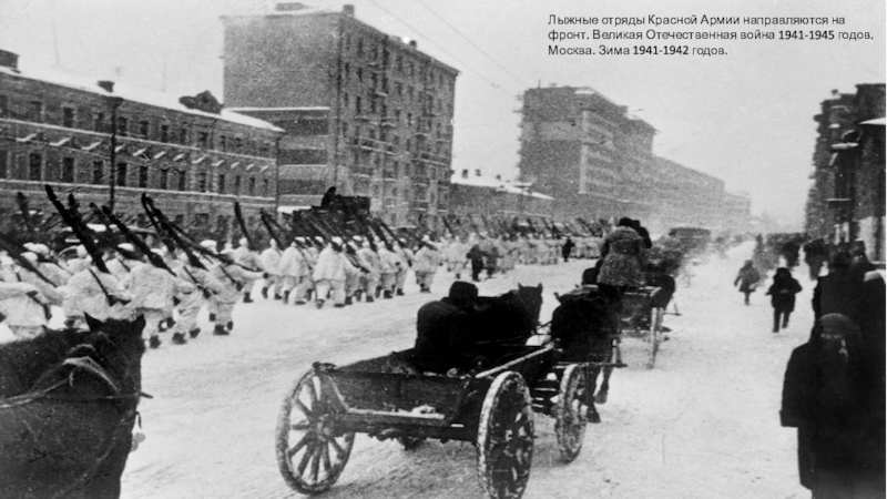 Слайд 3Лыжные отряды Красной Армии направляются на фронт. Великая Отечественная война 1941-1945