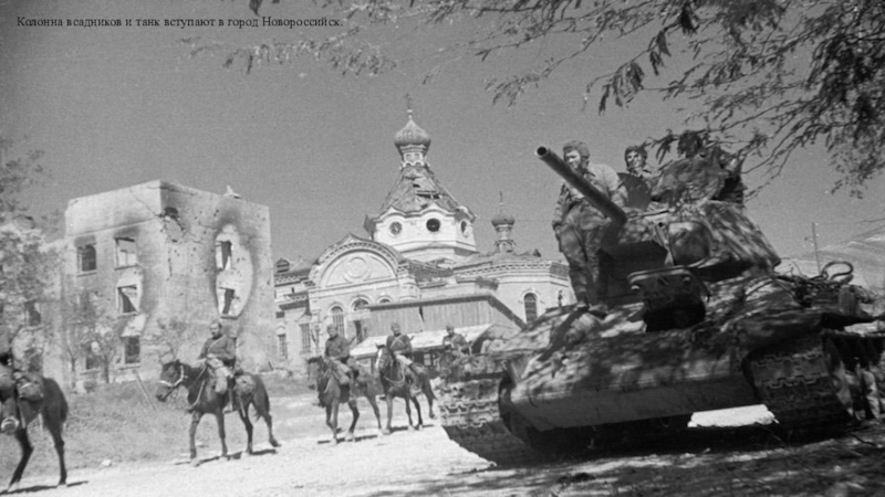Слайд 38Колонна всадников и танк вступают в город Новороссийск.