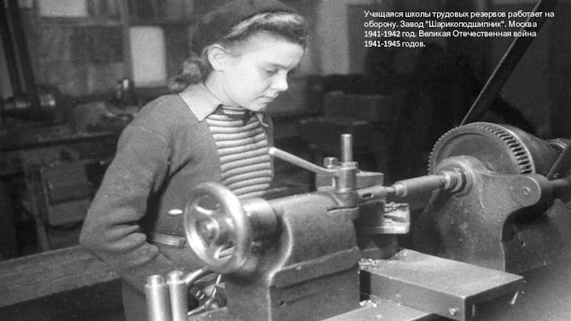 Слайд 4Учащаяся школы трудовых резервов работает на оборону. Завод "Шарикоподшипник". Москва 1941-1942