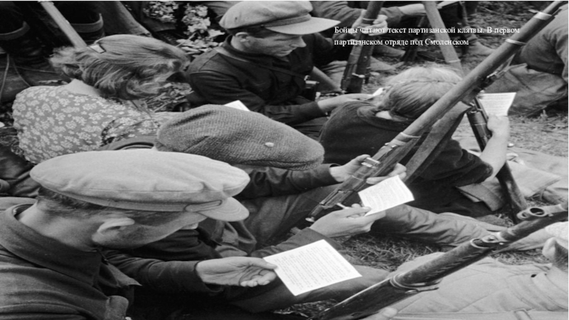 Слайд 62Бойцы читают текст партизанской клятвы. В первом партизанском отряде под Смоленском.