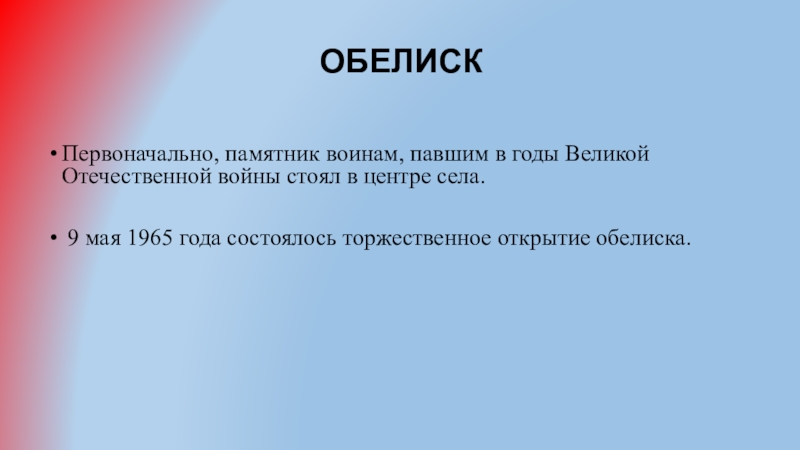ОБЕЛИСК Первоначально, памятник воинам, павшим в годы Великой Отечественной войны стоял в центре села. 9 мая 1965