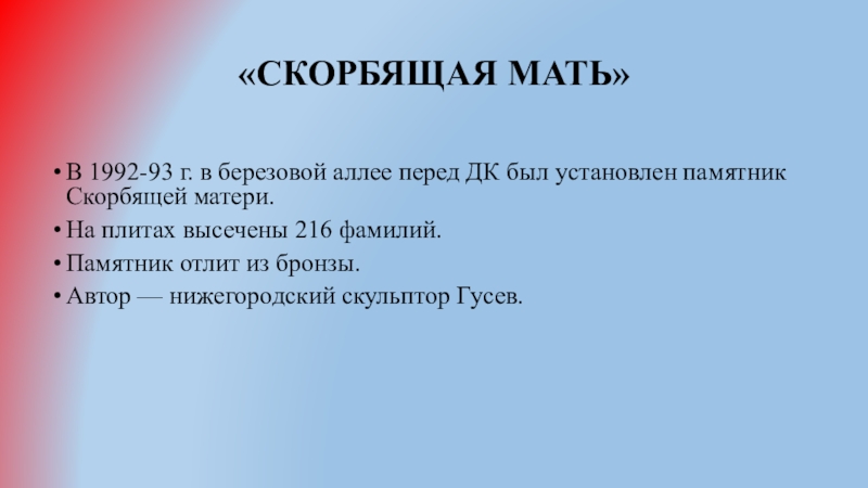 «СКОРБЯЩАЯ МАТЬ»В 1992-93 г. в березовой аллее перед ДК был установлен памятник Скорбящей матери. На плитах высечены
