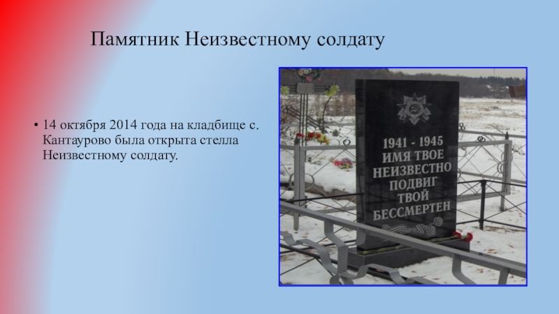 Памятник Неизвестному солдату14 октября 2014 года на кладбище с. Кантаурово была открыта стелла Неизвестному солдату.
