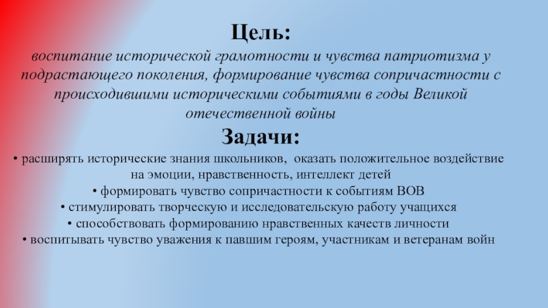Цель: воспитание исторической грамотности и чувства патриотизма у подрастающего поколения, формирование чувства сопричастности с происходившими историческими событиями в годы Великой отечественной войныЗадачи: расширять исторические знания школьников, оказать положительное воздействие на эмоции, нравственность, интеллект детей формировать чувство