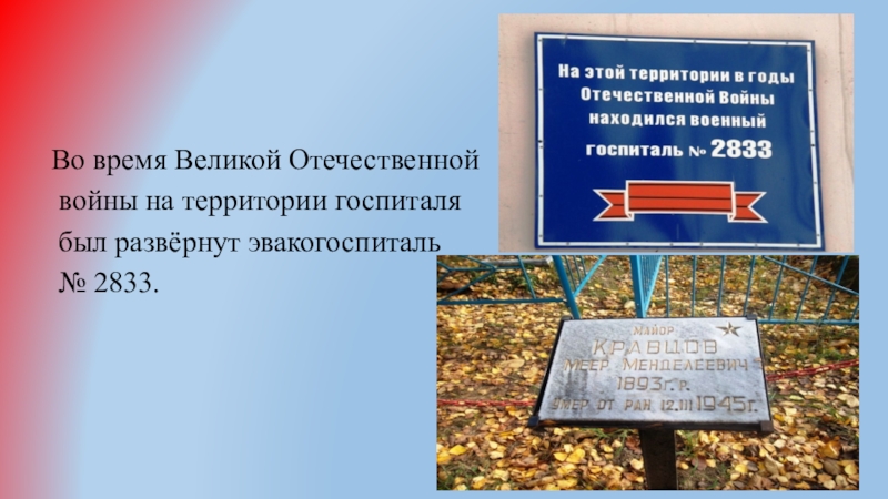 Во время Великой Отечественной войны на территории госпиталя был развёрнут эвакогоспиталь № 2833.