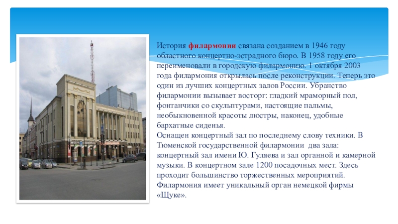 Слайд 6История филармонии связана созданием в 1946 году областного концертно-эстрадного бюро. В