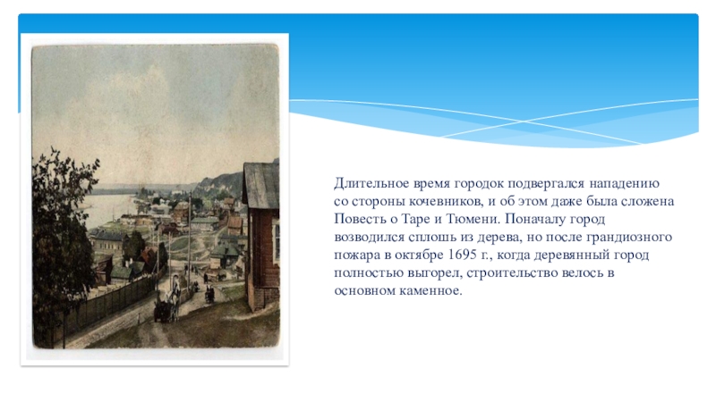 даже была сложена Повесть о Таре и Тюмени. Поначалу город возводился сплошь из дерева, но после грандиозного пожара в октябре 1695 г., когда деревянный город полностью выгорел, строительство велось в основном каменное.
