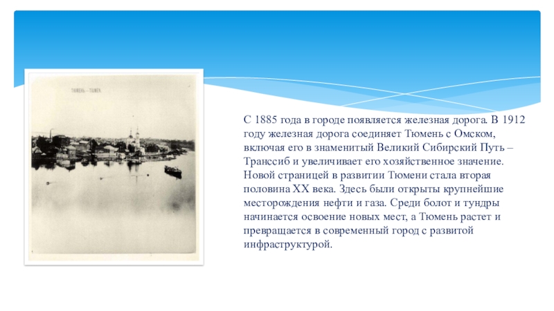 Новой страницей в развитии Тюмени стала вторая половина XX века. Здесь были открыты крупнейшие месторождения нефти и газа. Среди болот и тундры начинается освоение новых мест, а Тюмень растет и превращается в современный город с развитой инфраструктурой.