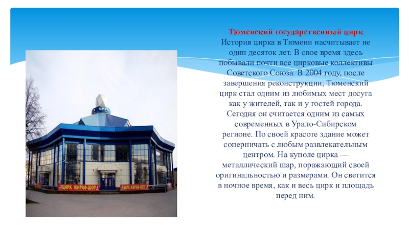 В свое время здесь побывали почти все цирковые коллективы Советского Союза. В 2004 году, после завершения реконструкции, Тюменский цирк стал одним из любимых мест досуга как у жителей, так и у гостей города. Сегодня он считается одним из самых современных в Урало-Сибирском регионе. По своей красоте здание может соперничать с любым развлекательным центром. На куполе цирка — металлический шар, поражающий своей оригинальностью и размерами. Он светится в ночное время, как и весь цирк и площадь перед ним.