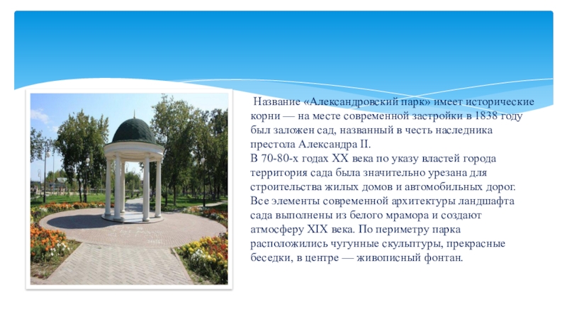 Слайд 5 Название «Александровский парк» имеет исторические корни — на месте современной застройки