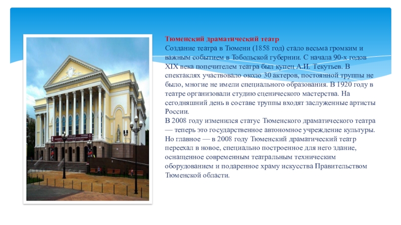 и важным событием в Тобольской губернии. С начала 90-х годов XIX века попечителем театра был купец А.И. Текутьев. В спектаклях участвовало около 30 актеров, постоянной труппы не было, многие не имели специального образования. В 1920 году в театре организовали студию сценического мастерства. На сегодняшний день в составе труппы входят заслуженные артисты России.