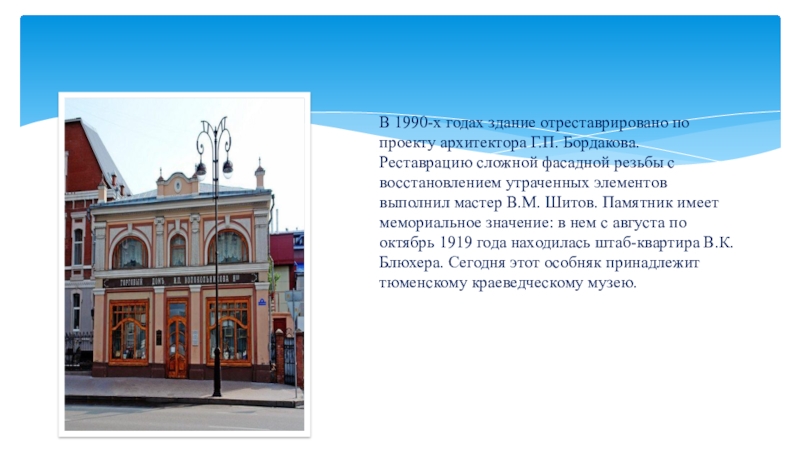 сложной фасадной резьбы с восстановлением утраченных элементов выполнил мастер В.М. Шитов. Памятник имеет мемориальное значение: в нем с августа по октябрь 1919 года находилась штаб-квартира В.К. Блюхера. Сегодня этот особняк принадлежит тюменскому краеведческому музею.