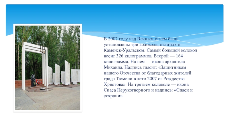 в Каменск-Уральском. Самый большой колокол весит 326 килограммов. Второй — 164 килограмма. На нем — икона архангела Михаила. Надпись гласит: «Защитникам нашего Отечества от благодарных жителей града Тюмени в лето 2007 от Рождества Христова». На третьем колоколе — икона Спаса Нерукотворного и надпись: «Спаси и сохрани».лемент площади Памяти — Памятник воинам, умершим от ран в госпиталях города Тюмени в 1941-1945 годах.