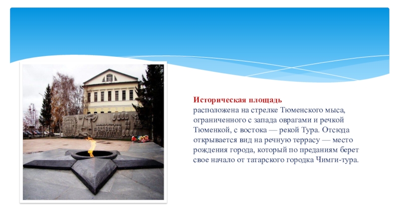 речкой Тюменкой, с востока — рекой Тура. Отсюда открывается вид на речную террасу — место рождения города, который по преданиям берет свое начало от татарского городка Чимги-тура.