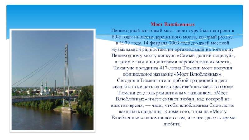 Сегодня в Тюмени стало доброй традицией в день свадьбы посещать одно из красивейших мест в городе Тюмени со столь романтичным названием. «Мост Влюбленных» имеет символ любви, над которой не властно время, — часы, чтобы влюбленным было легче назначать свидания. Кроме того, часы на «Мосту Влюбленных» напоминают о том, что всегда есть время любить.