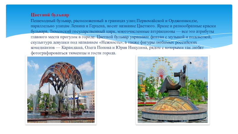 улицам Ленина и Герцена, носит название Цветного. Яркие и разнообразные краски бульвара, Тюменский государственный цирк, многочисленные аттракционы — все это атрибуты главного места прогулок в городе. Цветной бульвар украшают фонтан с музыкой и подсветкой, скульптура девушки под названием «Нежность», а также фигуры любимых российских комедиантов — Карандаша, Олега Попова и Юрия Никулина, рядом с которыми так любят фотографироваться тюменцы и гости города.
