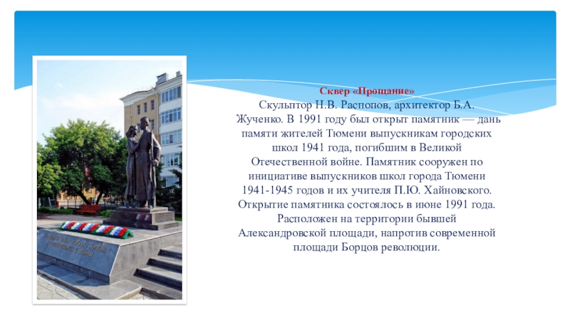 открыт памятник — дань памяти жителей Тюмени выпускникам городских школ 1941 года, погибшим в Великой Отечественной войне. Памятник сооружен по инициативе выпускников школ города Тюмени 1941-1945 годов и их учителя П.Ю. Хайновского. Открытие памятника состоялось в июне 1991 года. Расположен на территории бывшей Александровской площади, напротив современной площади Борцов революции.