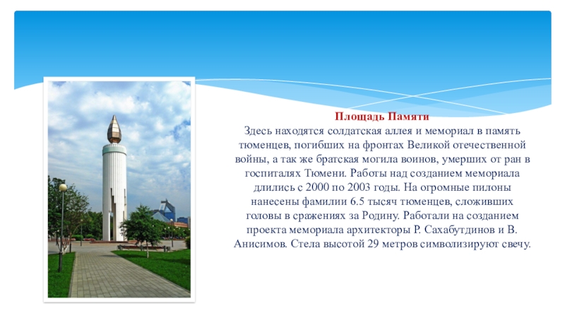 на фронтах Великой отечественной войны, а так же братская могила воинов, умерших от ран в госпиталях Тюмени. Работы над созданием мемориала длились с 2000 по 2003 годы. На огромные пилоны нанесены фамилии 6.5 тысяч тюменцев, сложивших головы в сражениях за Родину. Работали на созданием проекта мемориала архитекторы Р. Сахабутдинов и В. Анисимов. Стела высотой 29 метров символизируют свечу.