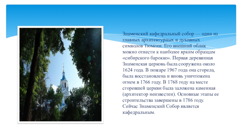 Тюмени. Его внешний облик можно отнести к наиболее ярким образцам «сибирского барокко». Первая деревянная Знаменская церковь была сооружена около 1624 года. В пожаре 1967 года она сгорела, была восстановлена и вновь уничтожена огнем в 1766 году. В 1768 году на месте сгоревшей церкви была заложена каменная (архитектор неизвестен). Основные этапы ее строительства завершены в 1786 году. Сейчас Знаменский Собор является кафедральным. храмом города Тюмени.