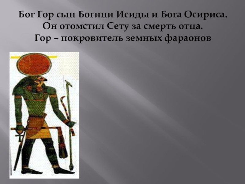 Слайд 12Бог Гор сын Богини Исиды и Бога Осириса. Он отомстил Сету