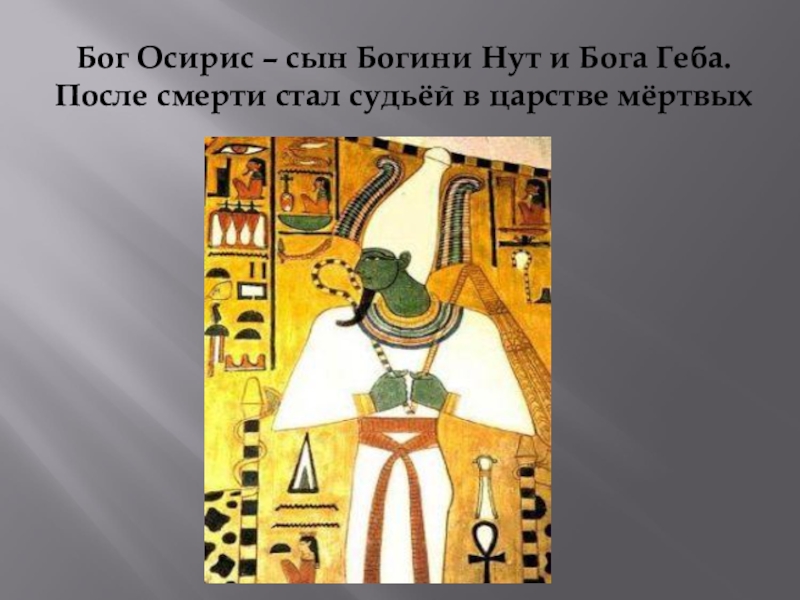Слайд 10Бог Осирис – сын Богини Нут и Бога Геба. После смерти