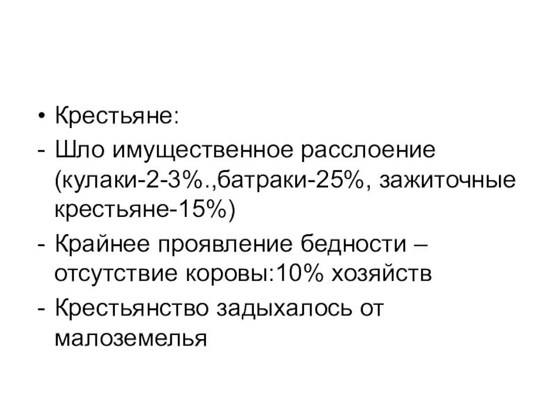 Шло имущественное расслоение(кулаки-2-3%.,батраки-25%, зажиточные крестьяне-15%)