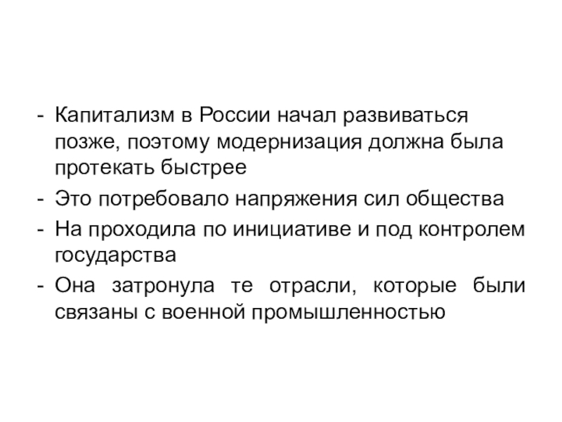 Капитализм в России начал развиваться позже, поэтому модернизация должна была протекать