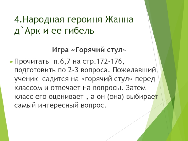 стр.172-176, подготовить по 2-3 вопроса. Пожелавший ученик садится на «горячий стул» перед классом и отвечает на вопросы. Затем класс его оценивает , а он (она) выбирает самый интересный вопрос.
